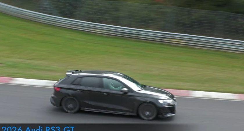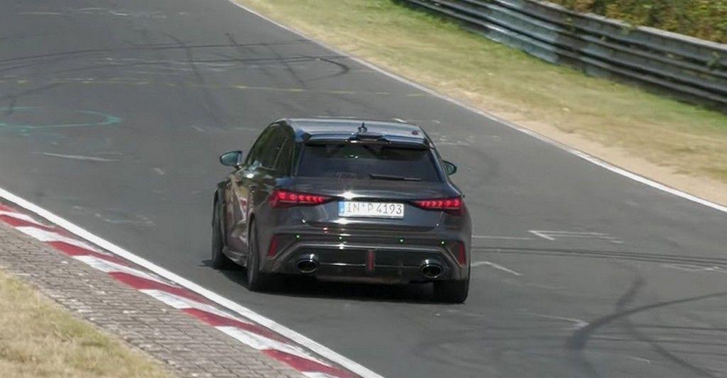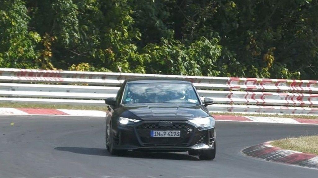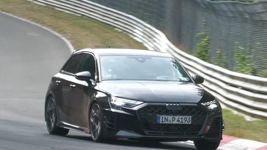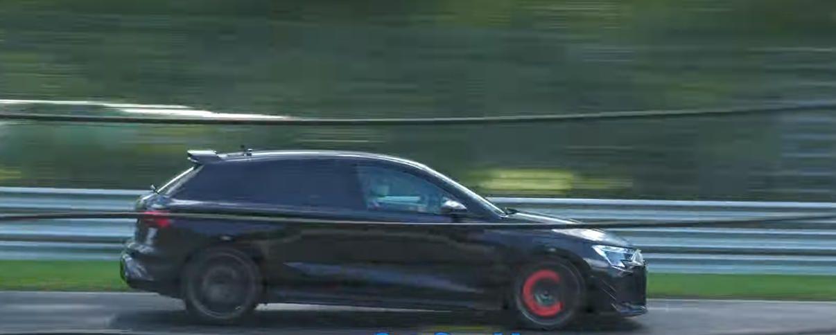 然而,在正式告别前,奥迪还准备让这具经典引擎华丽退场。 最近外媒CarSpyMedia在Nurburgring北环赛道捕捉到一辆疑似RS3 GT的原型车,披着厚重伪装却仍难掩其战斗气息。 从车头的空力鳍片与更宽大的下扰流可见端倪,这不仅是一台高性能版本,更可能是专为赛道驾驭优化的终极版RS3。 虽然带有明显的赛道设定,但该车仍将保有合法上路身份,成为能通勤、也能下赛道的钢炮猛兽。